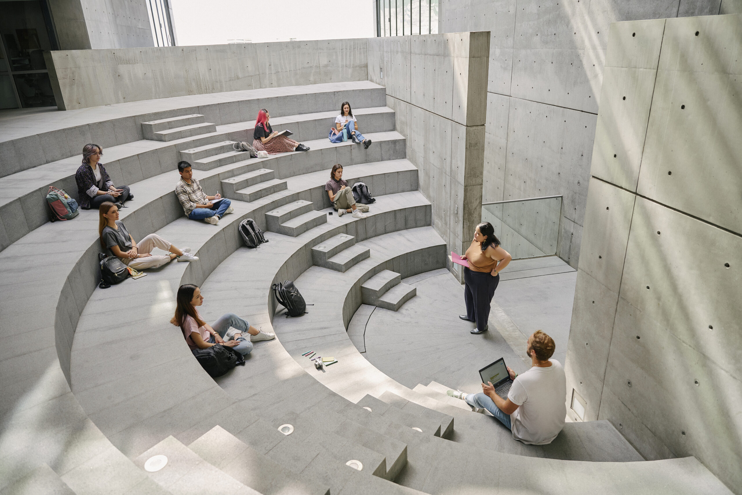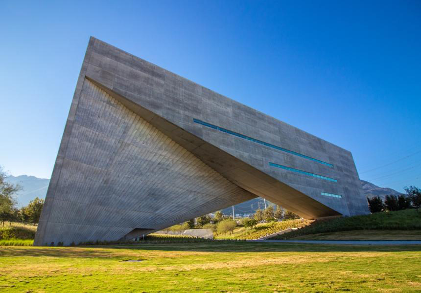 Igualmente, el emplazamiento del edificio en el campus de la UDEM es atípico y constituye un reto no menor. Mientras que todos los edificios del campus siguen una orientación oriente- poniente en sus ejes principales, y sus fachadas ven al sur y norte de acuerdo con los preceptos de la arquitectura racionalista, el edificio proyectado por Ando da un giro atípico de 45 grados en su orientación para alinearse con las visuales hacia la Sierra Madre y el Cerro de las Mitras. La inclinación formada por la vela sigue la caída natural de ambas montañas, enmarcando con esplendor las visuales hacia el entorno natural del campus; y en un gesto inesperado, captura lo más emblemático de nuestro pasaje: la monumentalidad de las montañas que nos rodean.